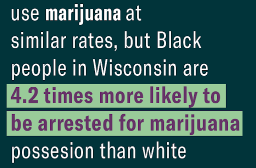 Additionally, Black and white people use marijuana at similar rates, but Black people in Wisconsin are 5.29 times more likely to be arrested for marijuana possession than white people.